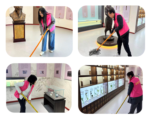 参观学习后,支部党员们拿起扫帚、拖把等清洁工具,分组对博物馆的展柜玻璃、说明标牌、公共休息区等进行了细致的擦拭和清扫。同志们干劲十足,默契配合,以实际行动为博物馆营造了一个更加整洁有序的参观环境,身体力行地“擦亮”了这扇展示中医药文化的“重要窗口”。这一环节不仅美化了博物馆的环境,更象征着支部党员净化思想、砥砺初心的实践过程。