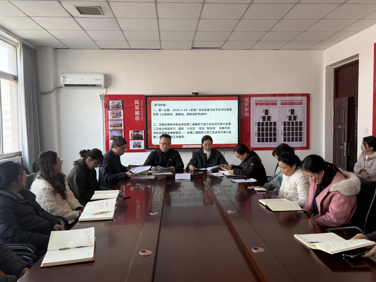 会上,张亮带领全体教师深入学习第一议题:《求是》杂志发表习近平总书记重要文章《让愿担当、敢担当、善担当蔚然成风》;院长李元元领学河南应用技术职业学院第二届教职工暨工会会员代表大会第二次会议专题学习:锚定“十五五”攻坚“新双高”全面开启学校高质量发展新篇章——在第二届教职工暨工会会员代表大会第二次会议上的工作报告;副书记郑言领学:中办印发《通知》在全党开展树立和践行正确政绩观学习教育、《以案释纪说法》第1辑、《以案释纪说法》第2辑;副院长唐贝领学全国教育工作会议精神、全省教育工作会议精神。