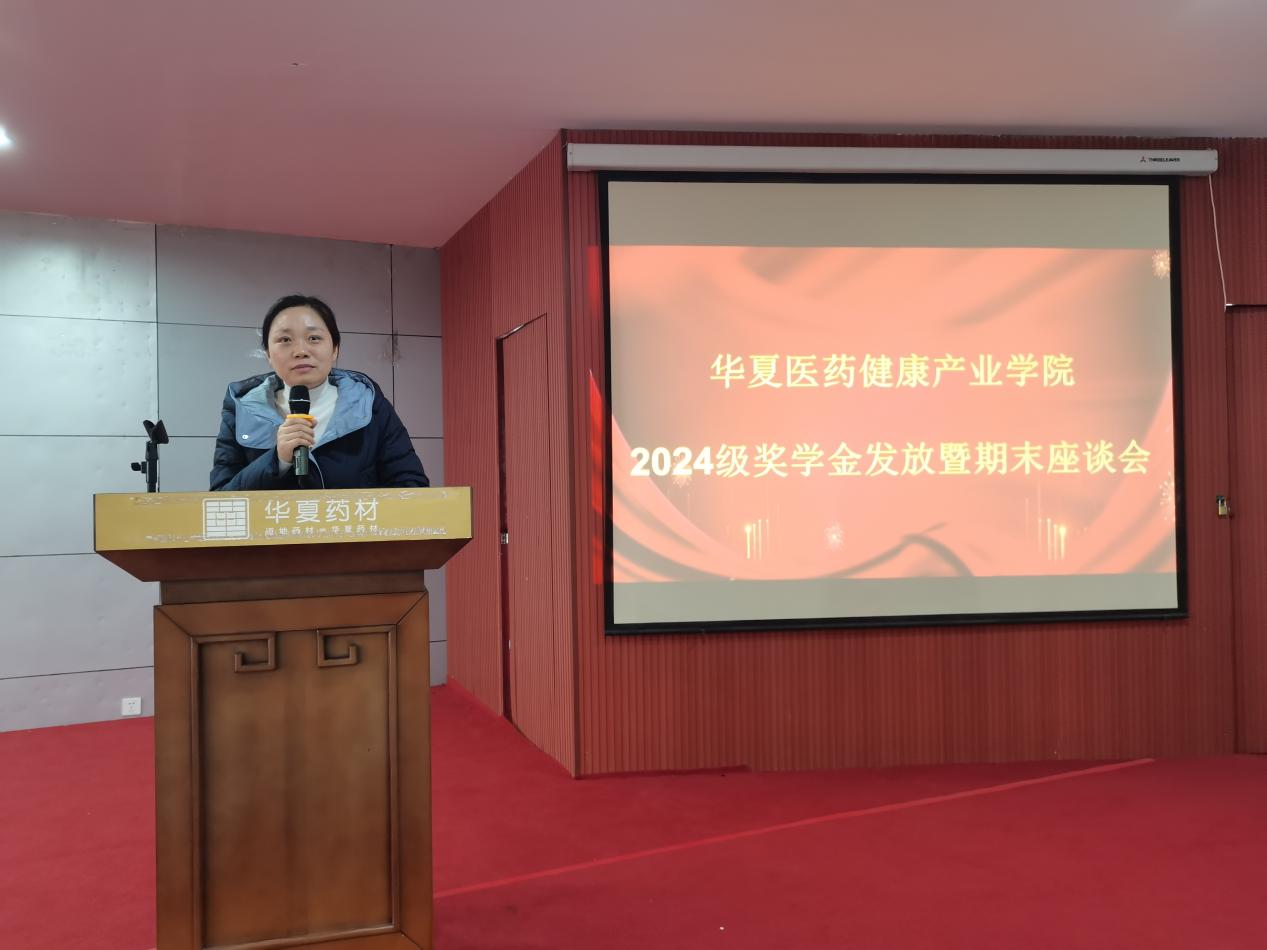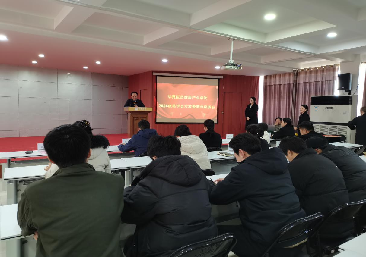 1月12日下午,华夏医药健康产业学院2024级学生奖学金发放仪式暨期末座谈会在禹州华夏药材有限公司6楼报告厅举行。华夏药材有限公司董事长赵军强、副总经理翟永奎,河南应用技术职业学院医药健康产业学院院长李元元、党总支副书记郑言、副院长唐贝等校企双方代表与2024级产业学院全体学生参会。
